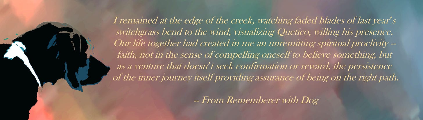 Rememberer with Dog is about a life journey of relationships -- continually progressing, multiplying, evolving. Following the thread of the story through the last chapter of the book, however, leaves absent the notion of concluding, instead replacing it with an affirmation of renewal, letting no one go, leaving no one behind, carrying all forward with oneself. If there is an aspect of “letting go” in the journey, it is not the letting go of any persons (and let’s be clear that I consider animals to be persons, as much in possession of their own unique personalities as I am in my own), but the letting go of suffering.